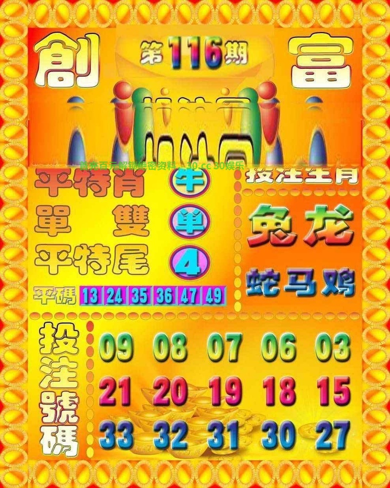 | 116期港彩创富投注解特开(马24) 综合:兔龙蛇马鸡 主特:03.15.02.14.25.37.12.24.33.45 平特尾:4尾  |
